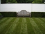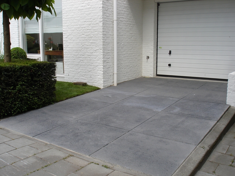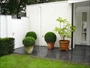 Kleine strakke tuin met terras en inrit van grote betontegels, veel gazon, taxusblokken, en bodembedekkers, tuin volledig voorzien van beregeningsinstallatie.