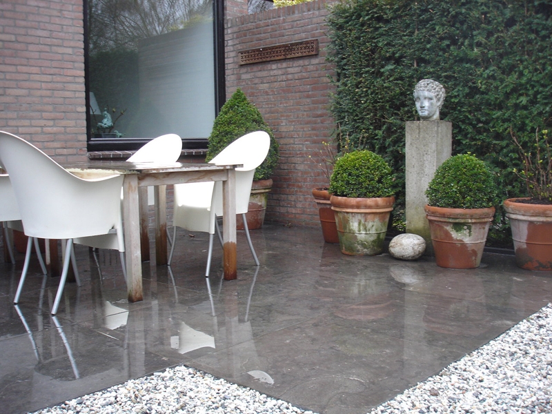 Onderhoudsvriendelijke tuin met terrassen in diverse soorten natuursteen, parelgrind, buxusbollen, taxusblokken en enkele bodembedekkers.